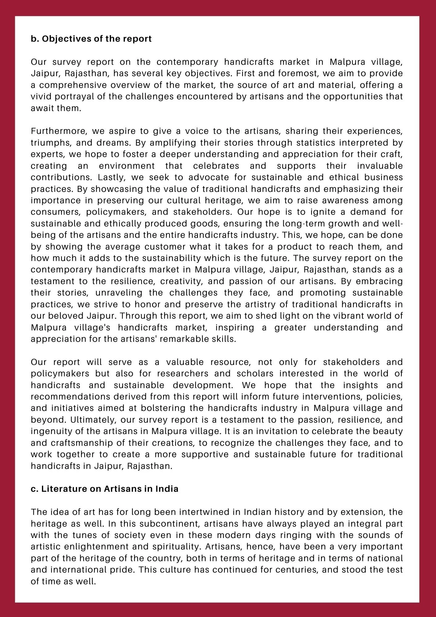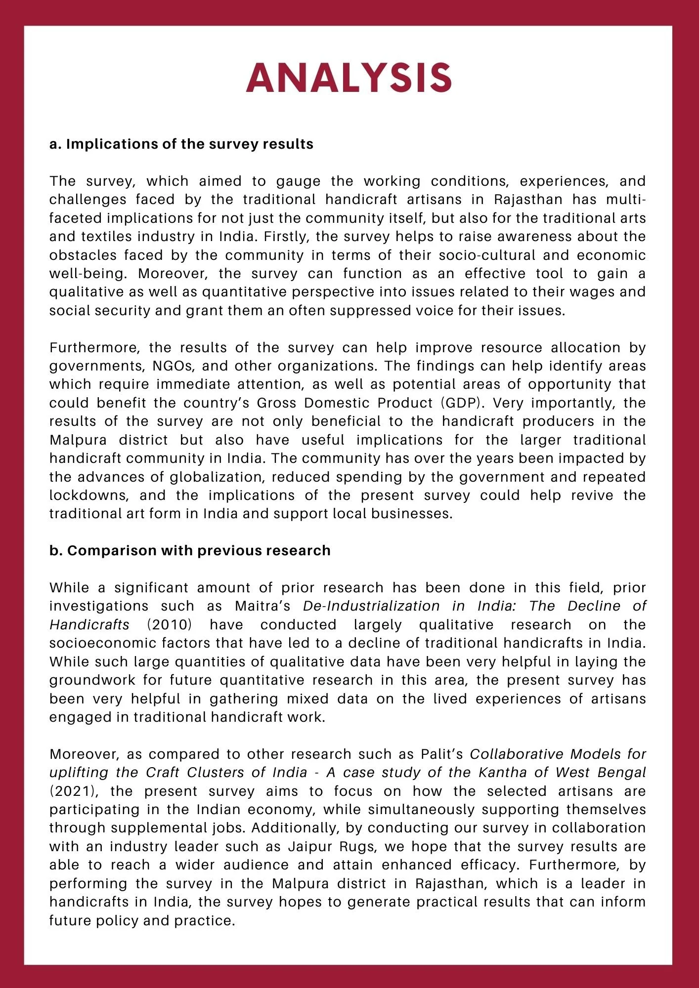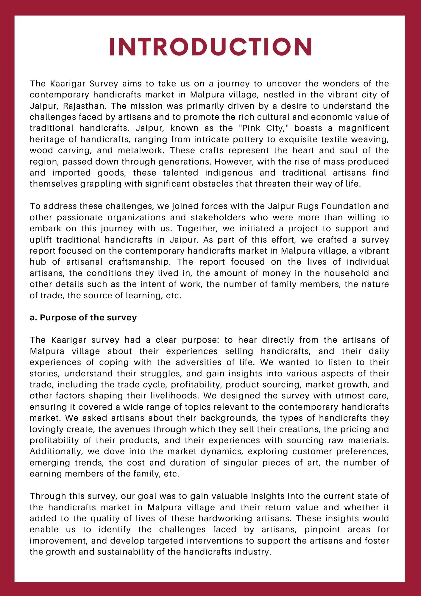 Driven by the intention to gather more information on the status of the contemporary handicrafts market in Jaipur, we worked on developing a unique survey in partnership with the Jaipur Rugs Foundation. This survey was distributed to artisans in Rajasthan in order to gather details on the lived experiences of selling handicrafts, as well as the trade cycle, profitability, product sourcing, market growth, and finally the challenges afflicting these communities. The purpose of this exercise was to establish a fertile database through which we have authored a comprehensive report based on these surveys for further educational awareness.